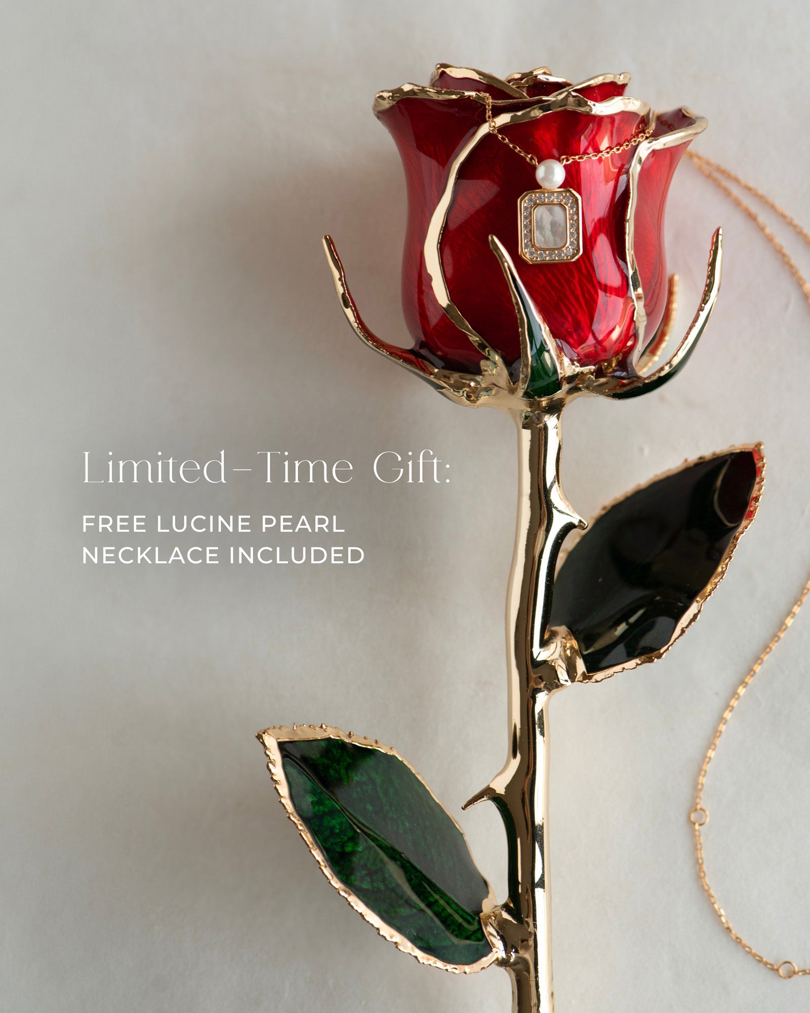 Every 24K Gold-Plated Rose comes with a complimentary Lucine Pearl Necklace (valued at $99 USD).