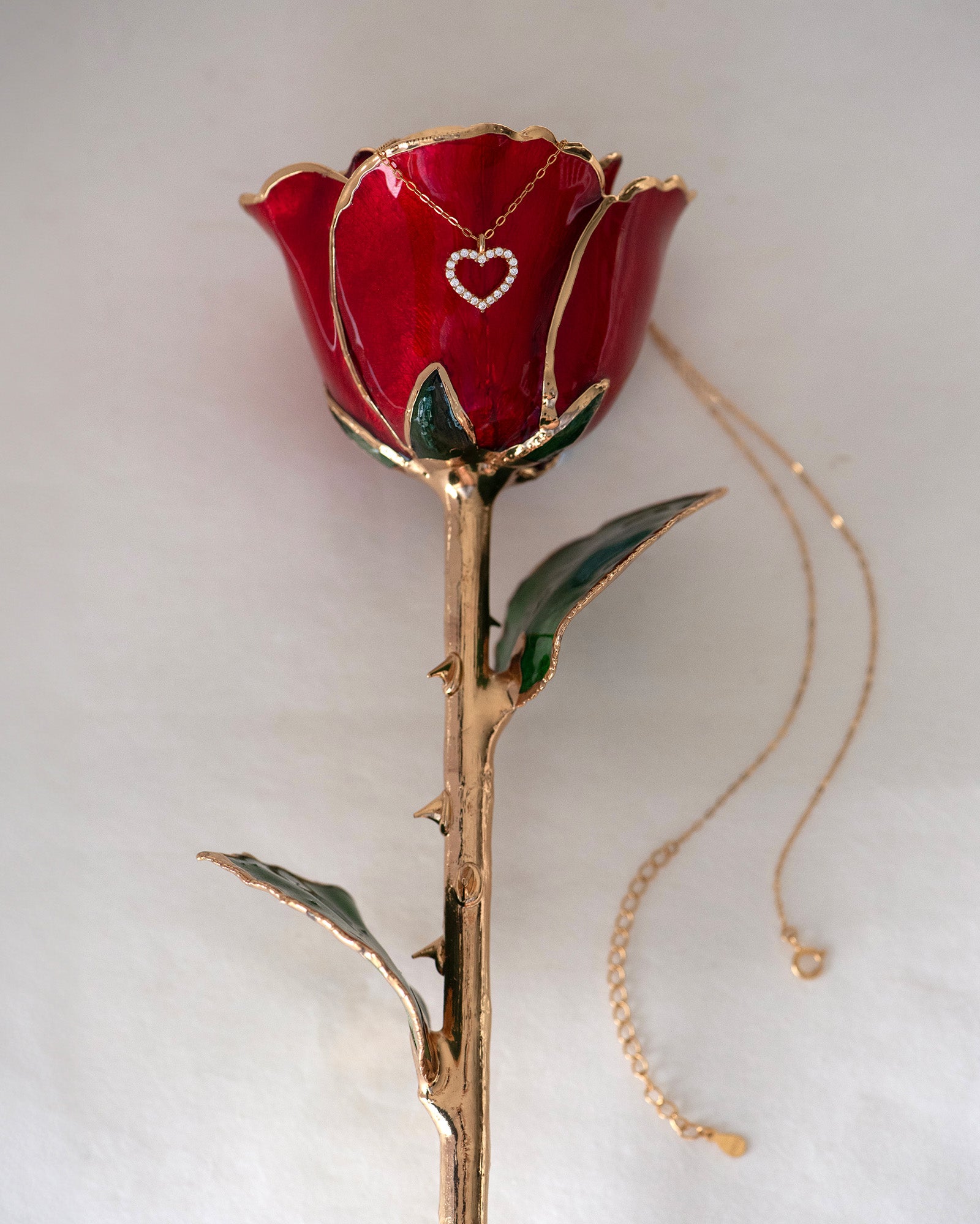 To maintain the beauty of your rose, keep it in a cool, dry place away from sunlight, moisture, and harsh chemicals. Gently wipe with a soft, lint-free cloth to remove dust or fingerprints. Handle with care to preserve its delicate petals and gold plating.