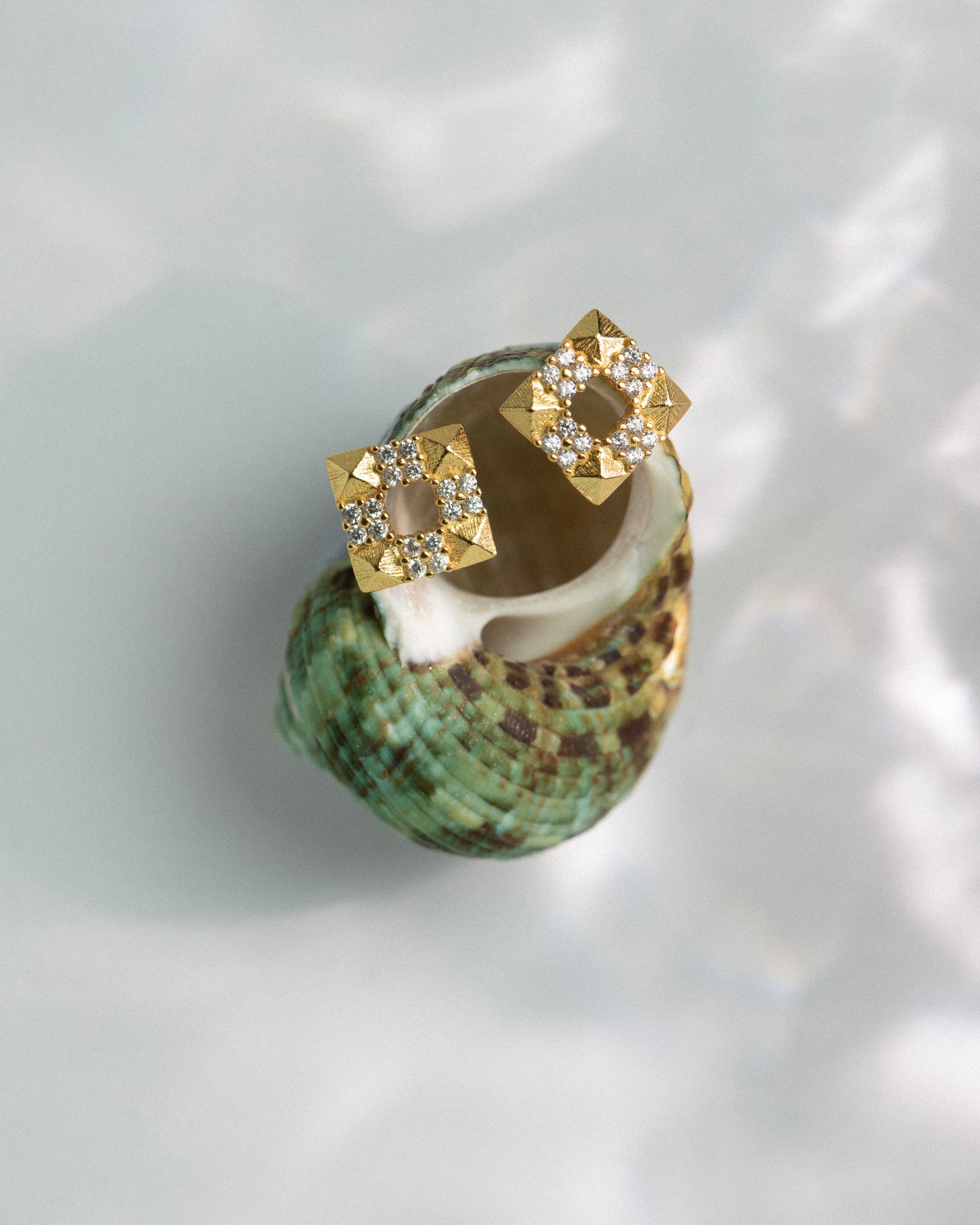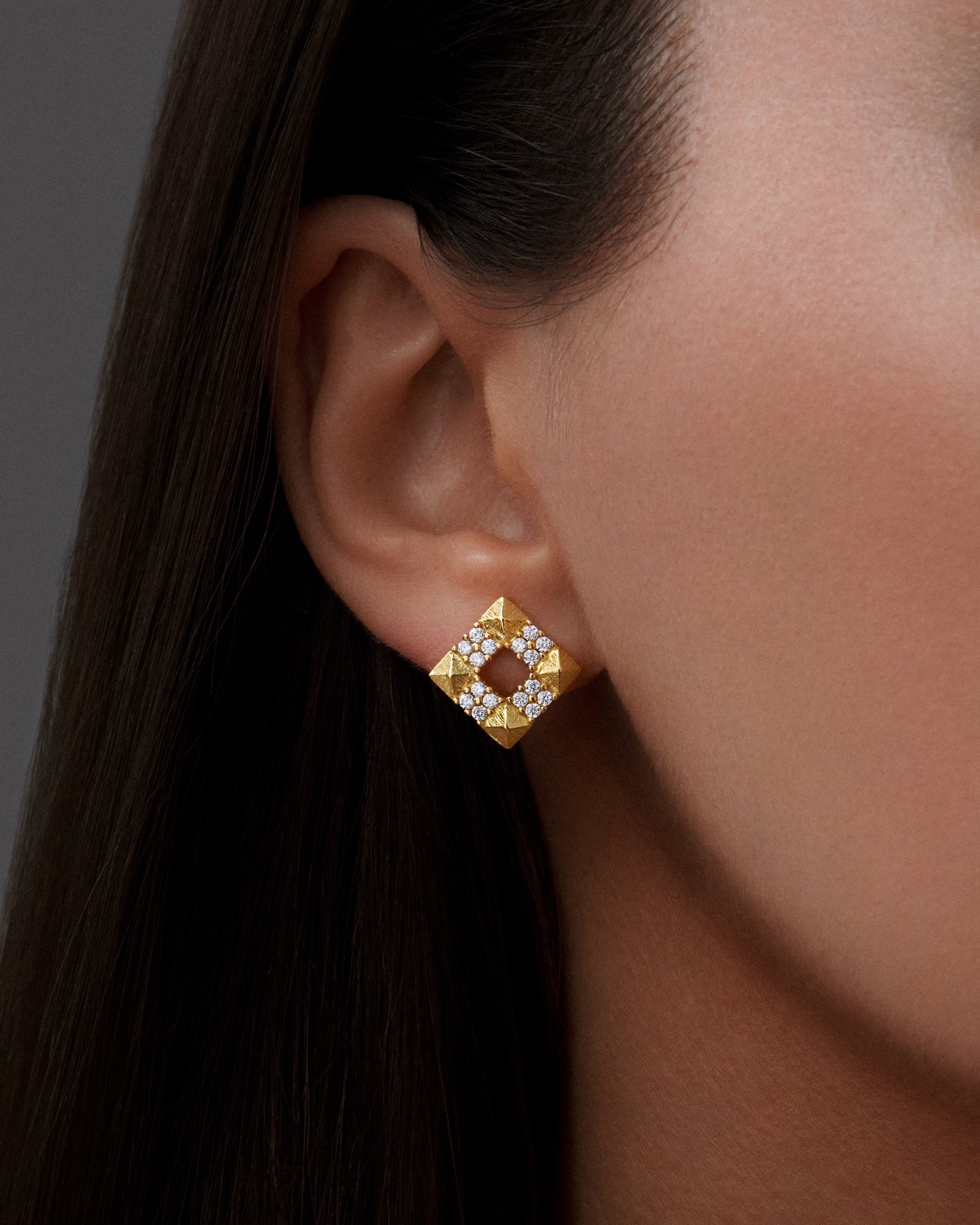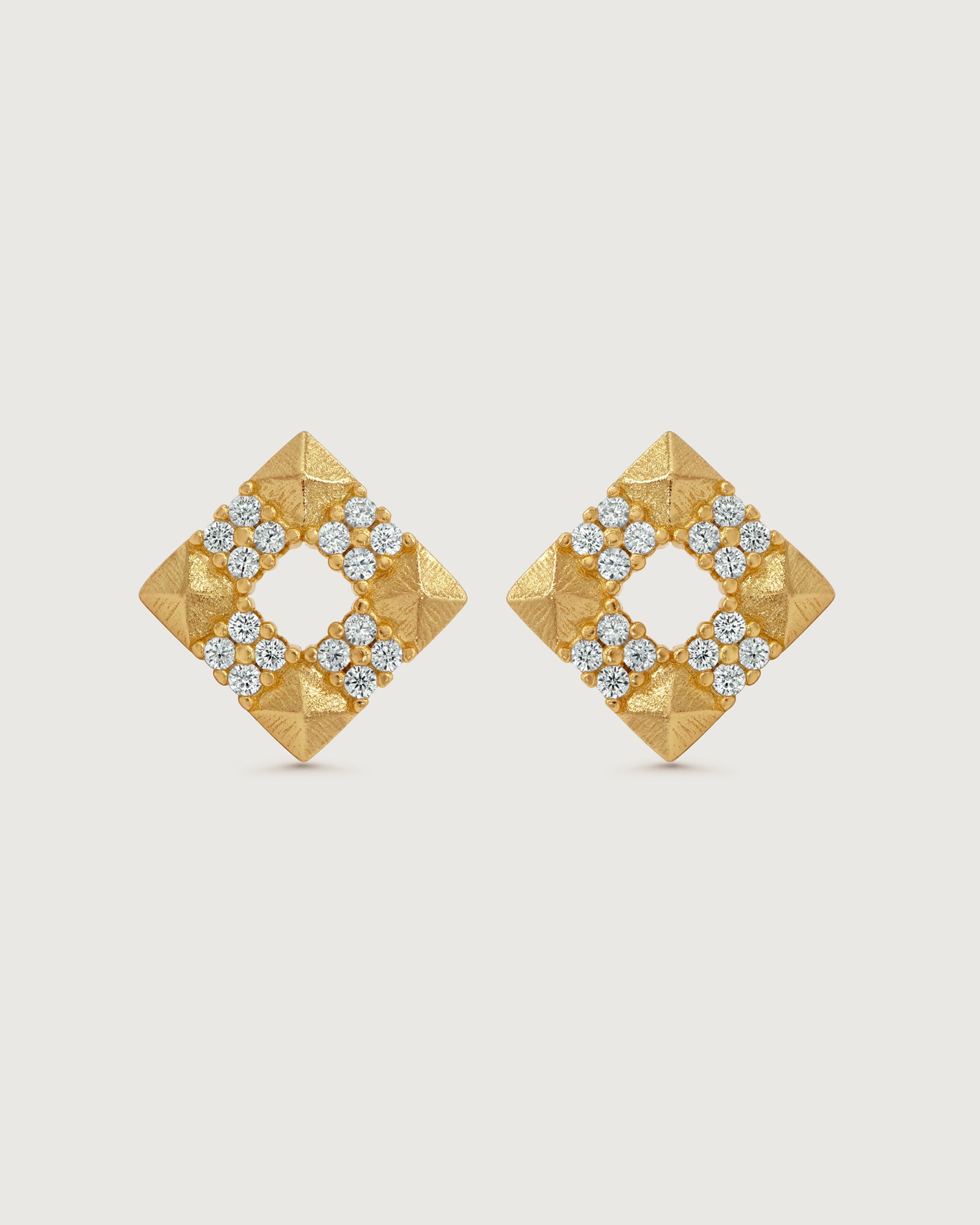 Celebrate simplicity and grace with the Aria Earrings, crafted from 18K gold-plated sterling silver. These square-shaped studs exude vintage charm, enhanced by a brushed gold texture. Adorned with symmetrically positioned cubic zirconia crystals, they deliver a refined sparkle that elevates any outfit.