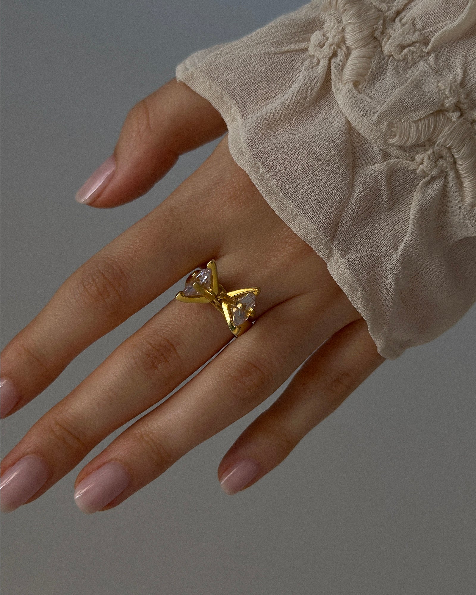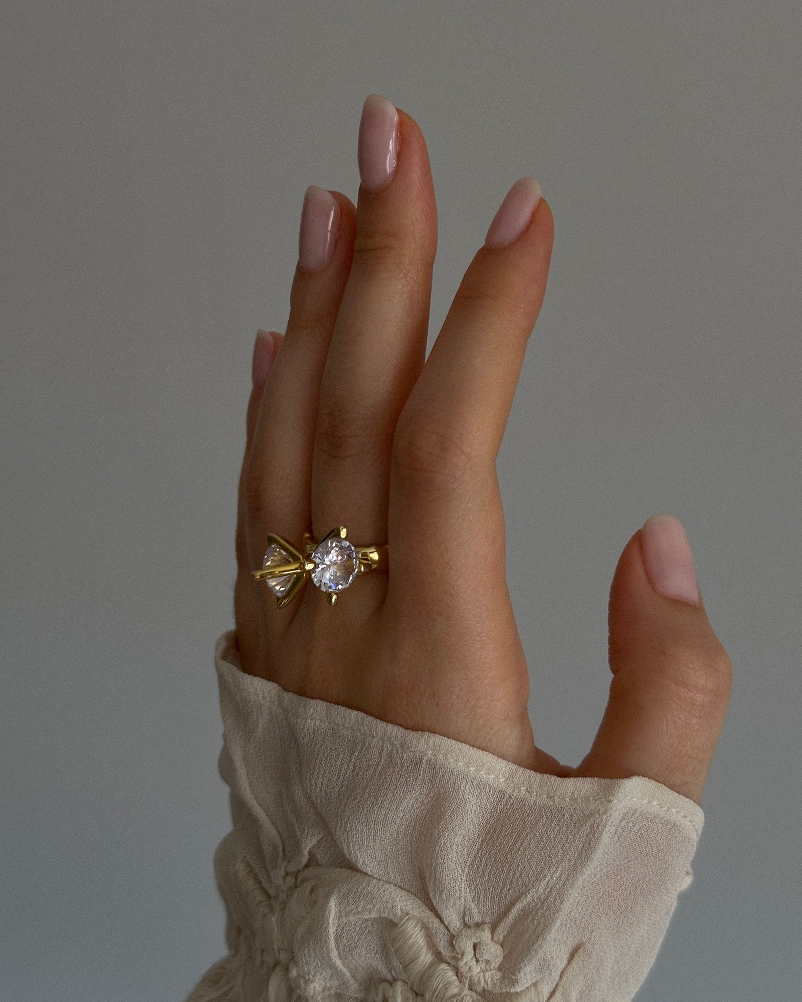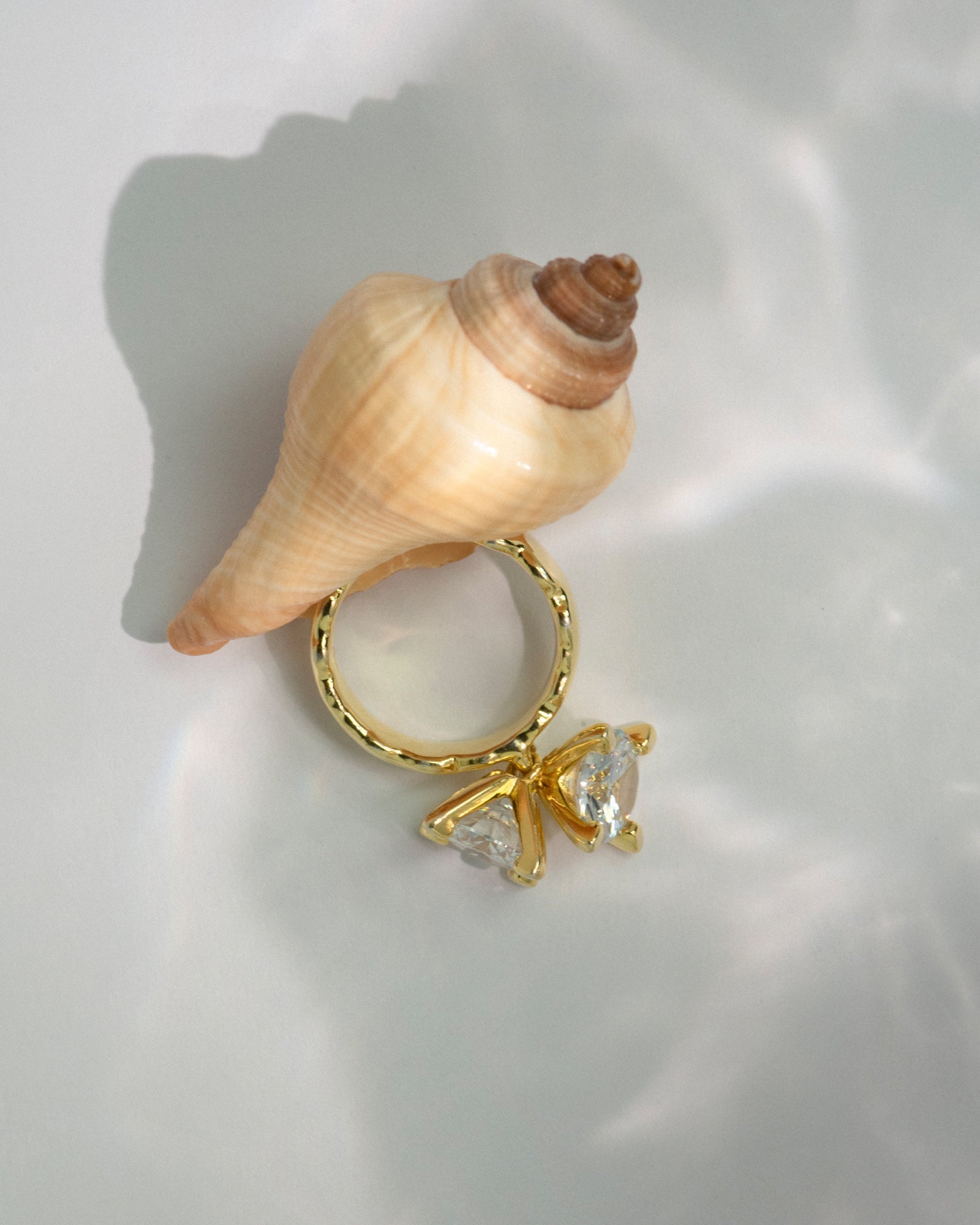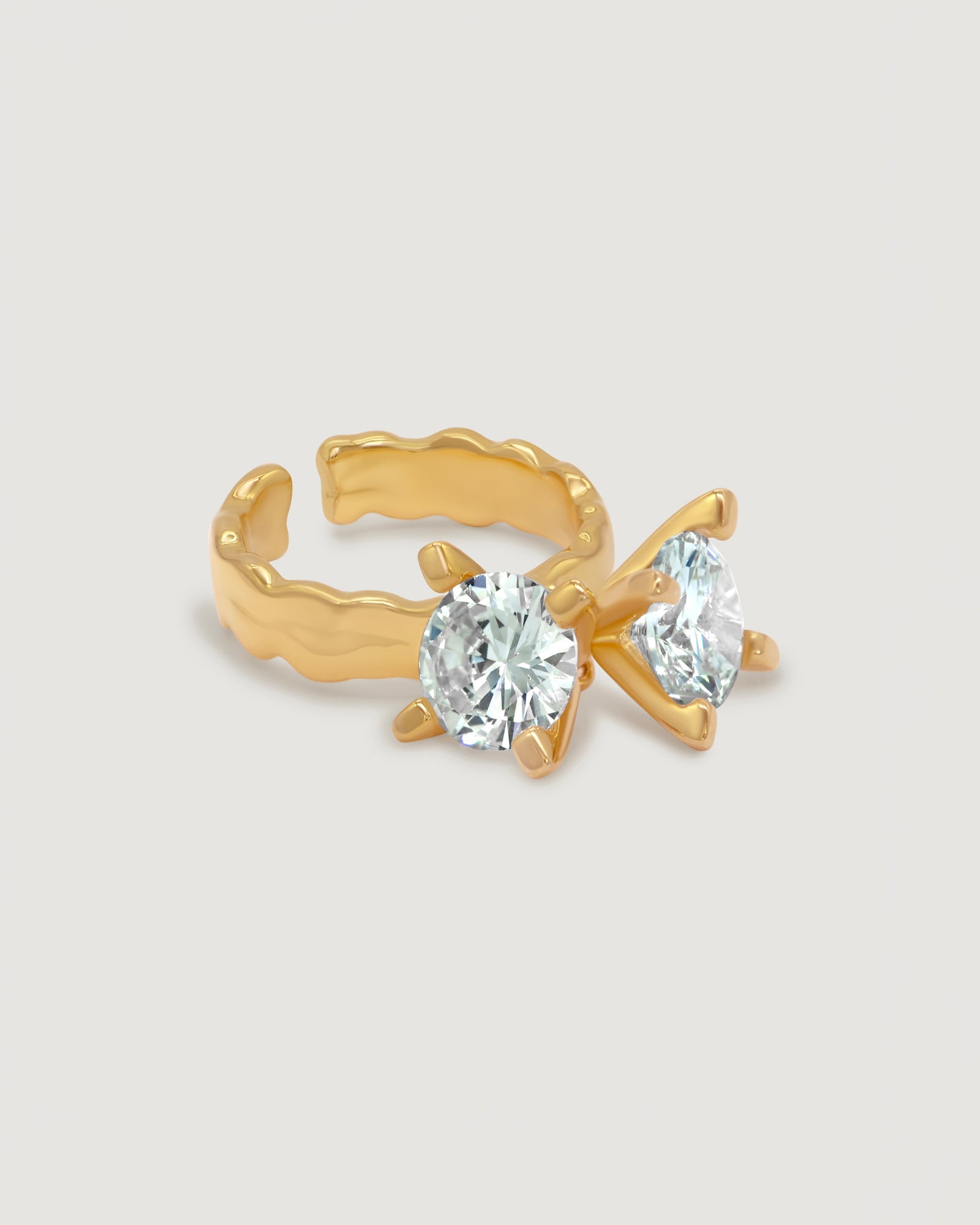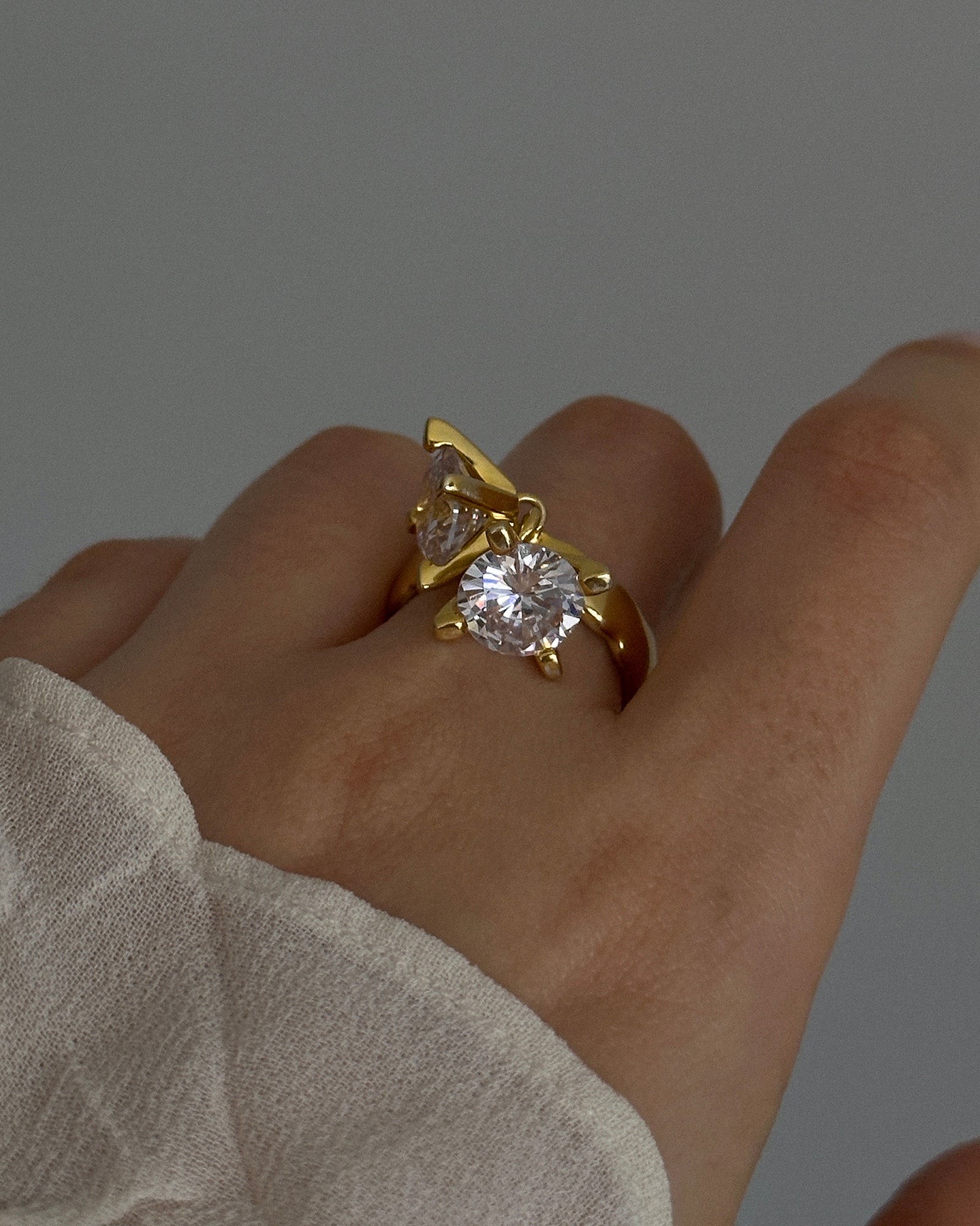 The Aurelia Ring captures an aura of refined elegance, where a smooth, organic-shaped band plated in polished 18K gold is crowned with two radiant cubic zirconia stones. Held in timeless four-claw settings, these shimmering stones evoke a sense of sophisticated allure, making this ring the ultimate statement. Crafted for those whose grace leaves a lasting impression.