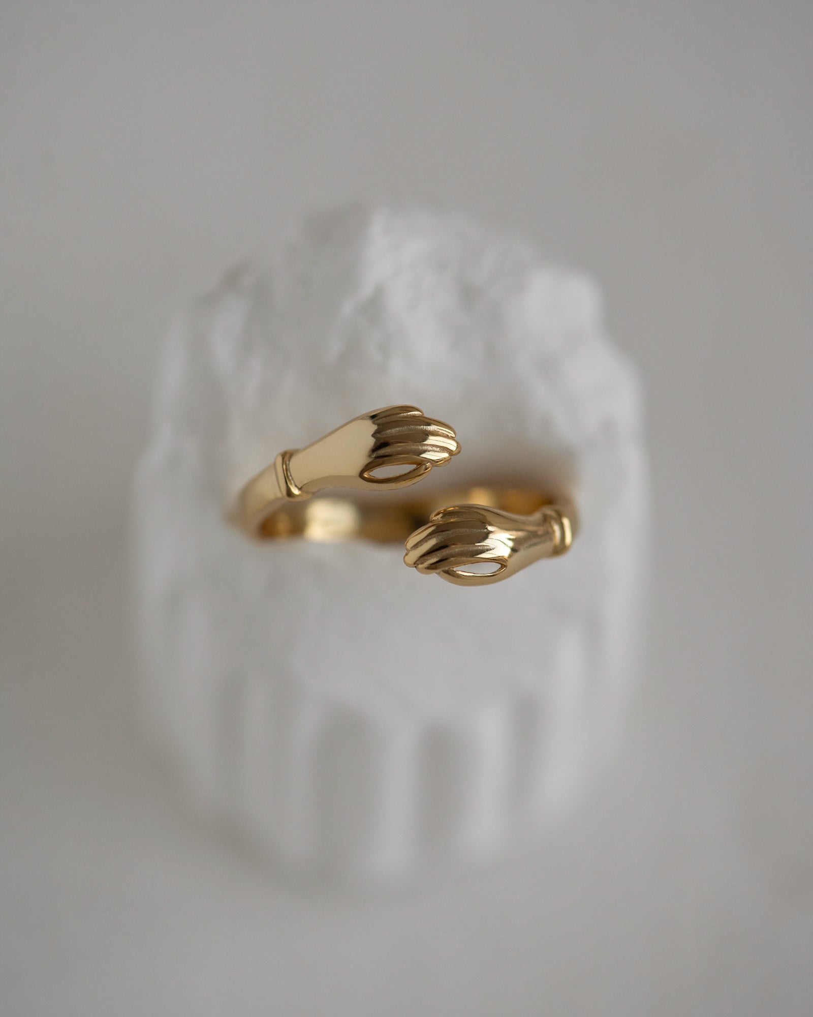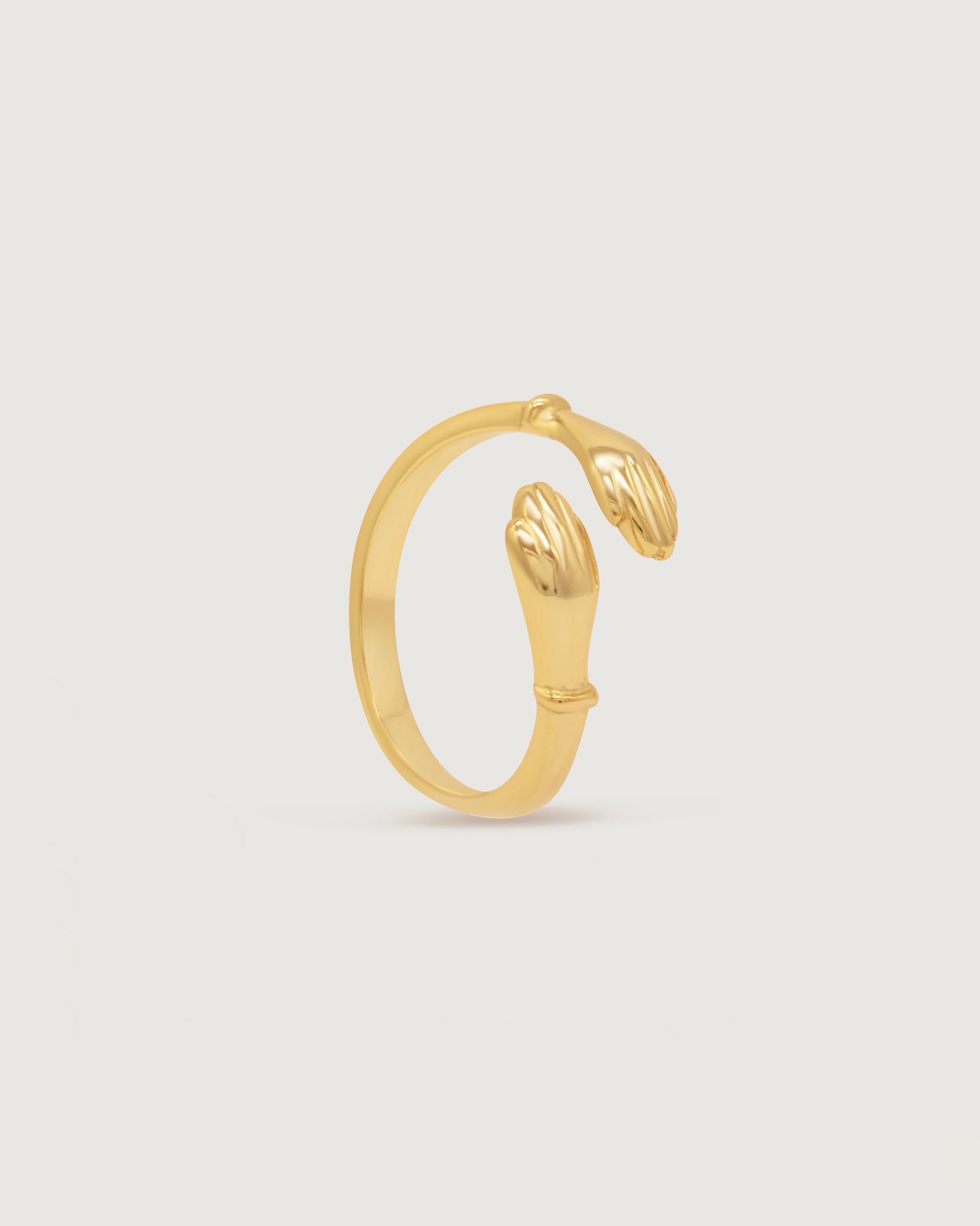 The Leonie Ring captures the quiet power of a gentle touch. Featuring two sculpted hands reaching toward one another in an eternal embrace, this handcrafted piece is a poetic symbol of love, connection and protection. Crafted from 18K gold-plated sterling silver, its open-band silhouette adjusts with ease - perfect worn alone or layered with intention.