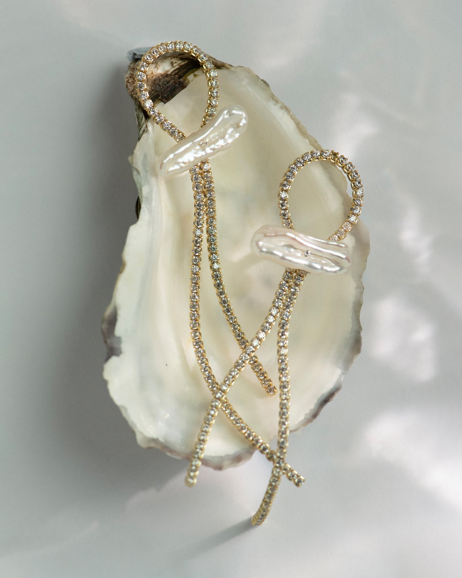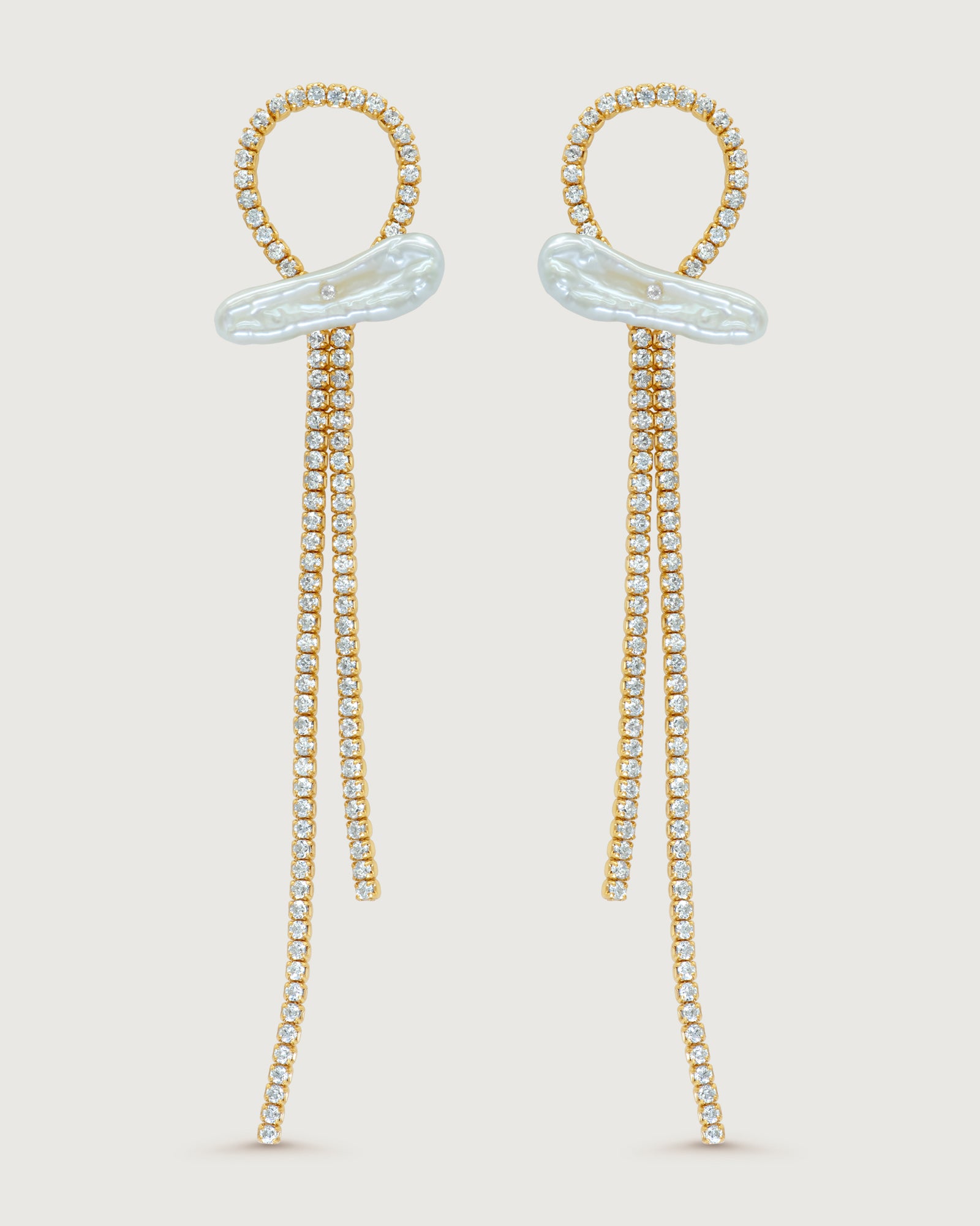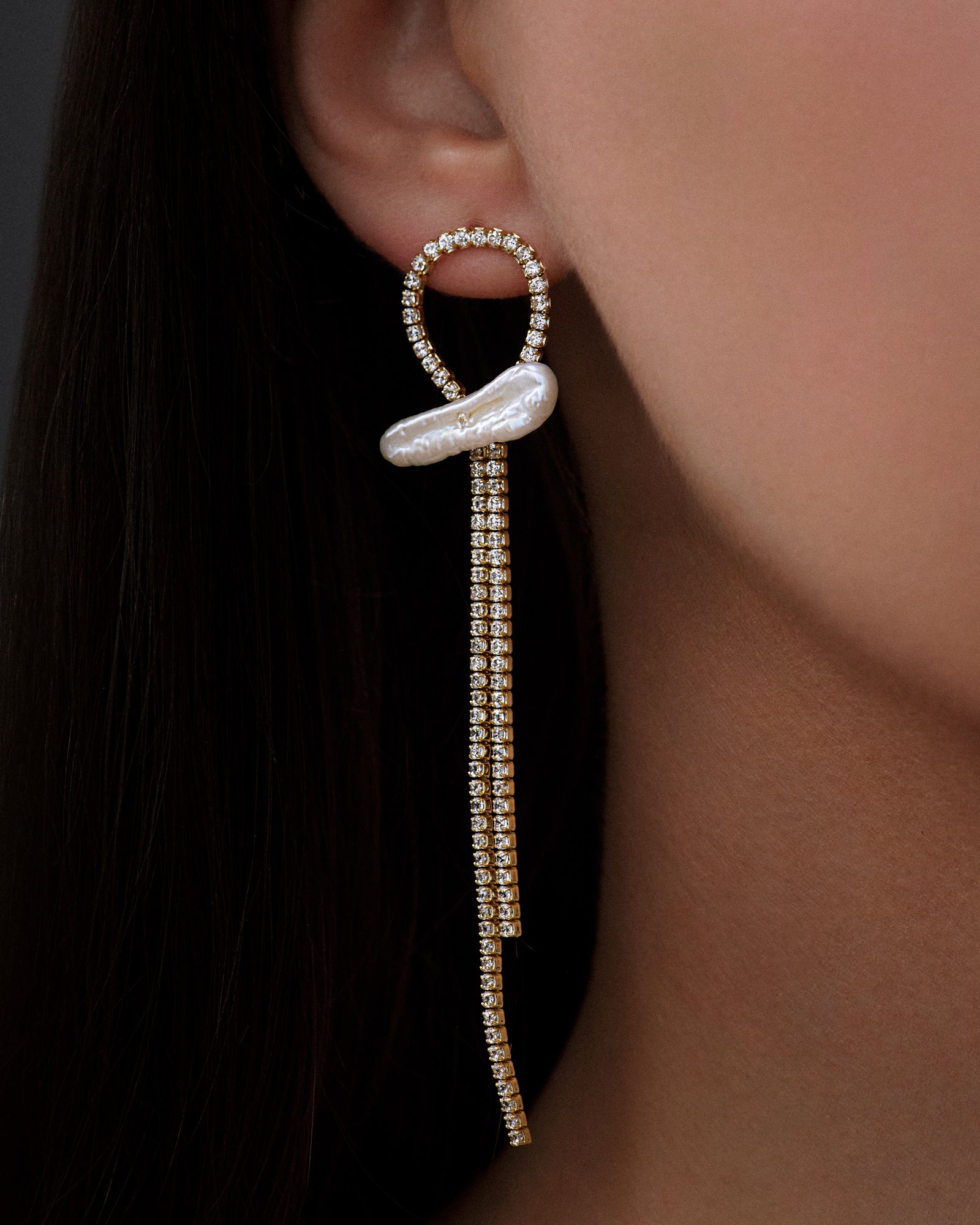 The Stella Earrings embody the ethereal beauty of starlit nights with their luminous design. Cascading strands of sparkling cubic zirconia crystals are elegantly anchored by an irregular freshwater pearl, while a radiant curve of crystals frames the piece with modern sophistication. Crafted with 18K gold plating, these earrings are a timeless statement, perfect for special occasions.