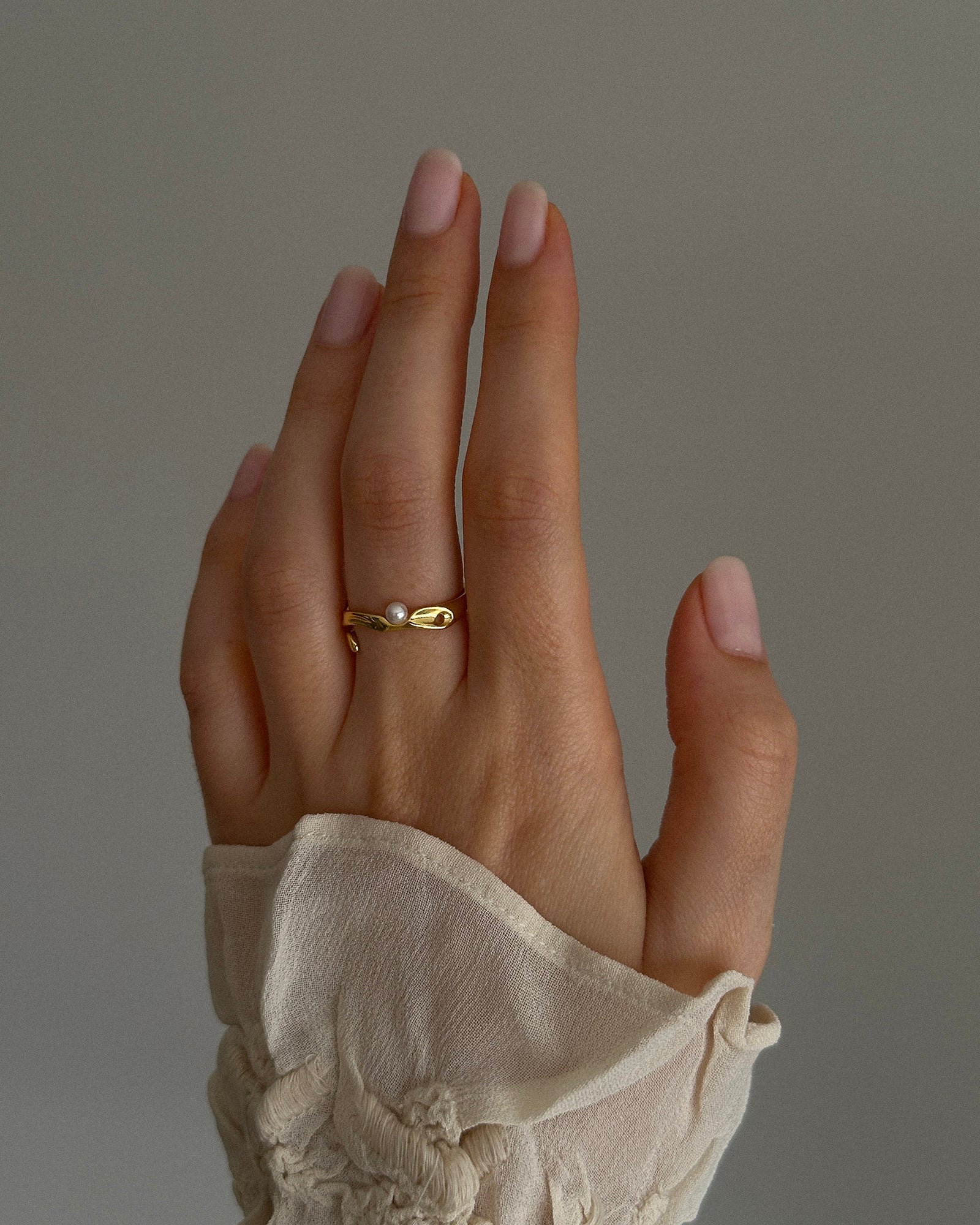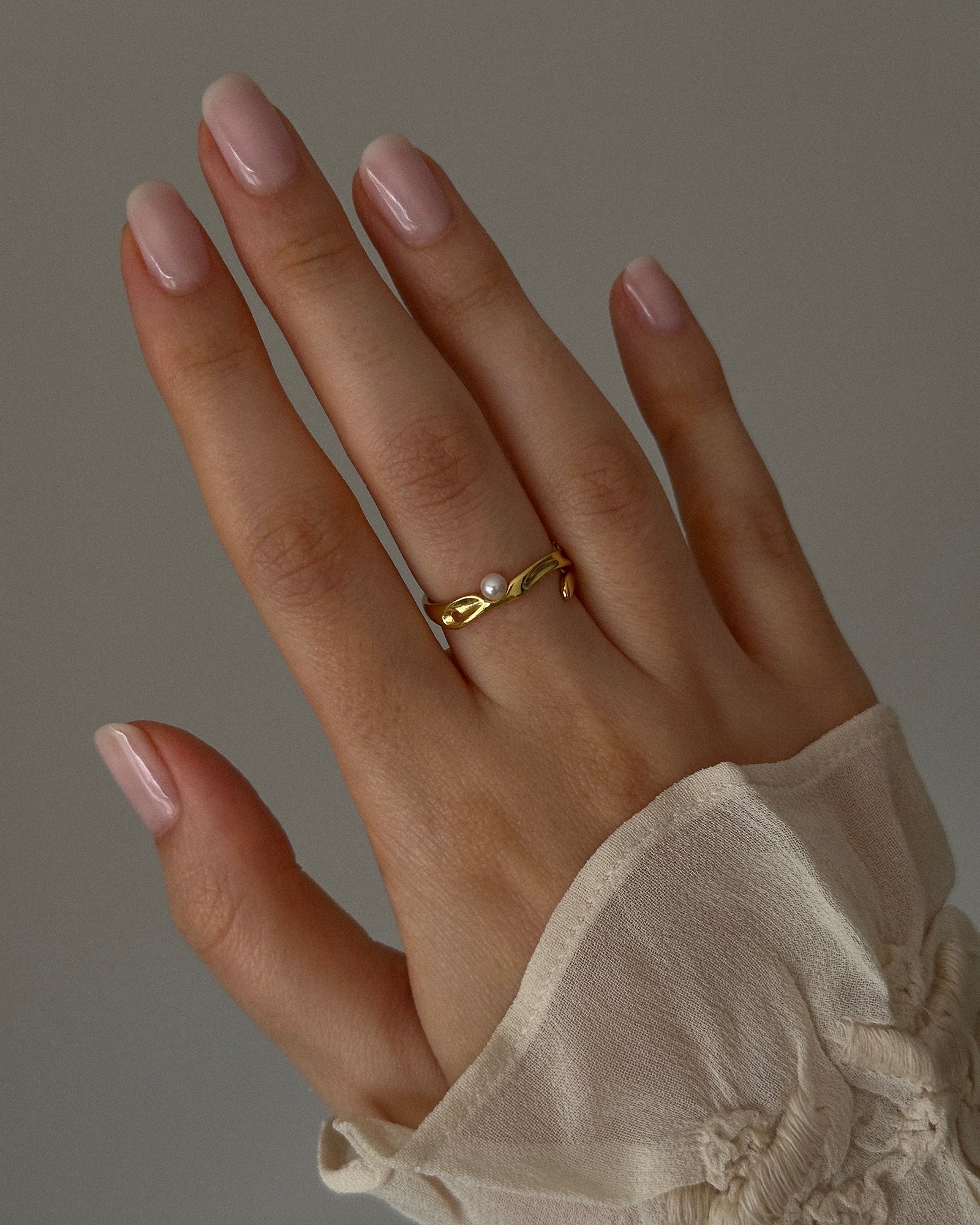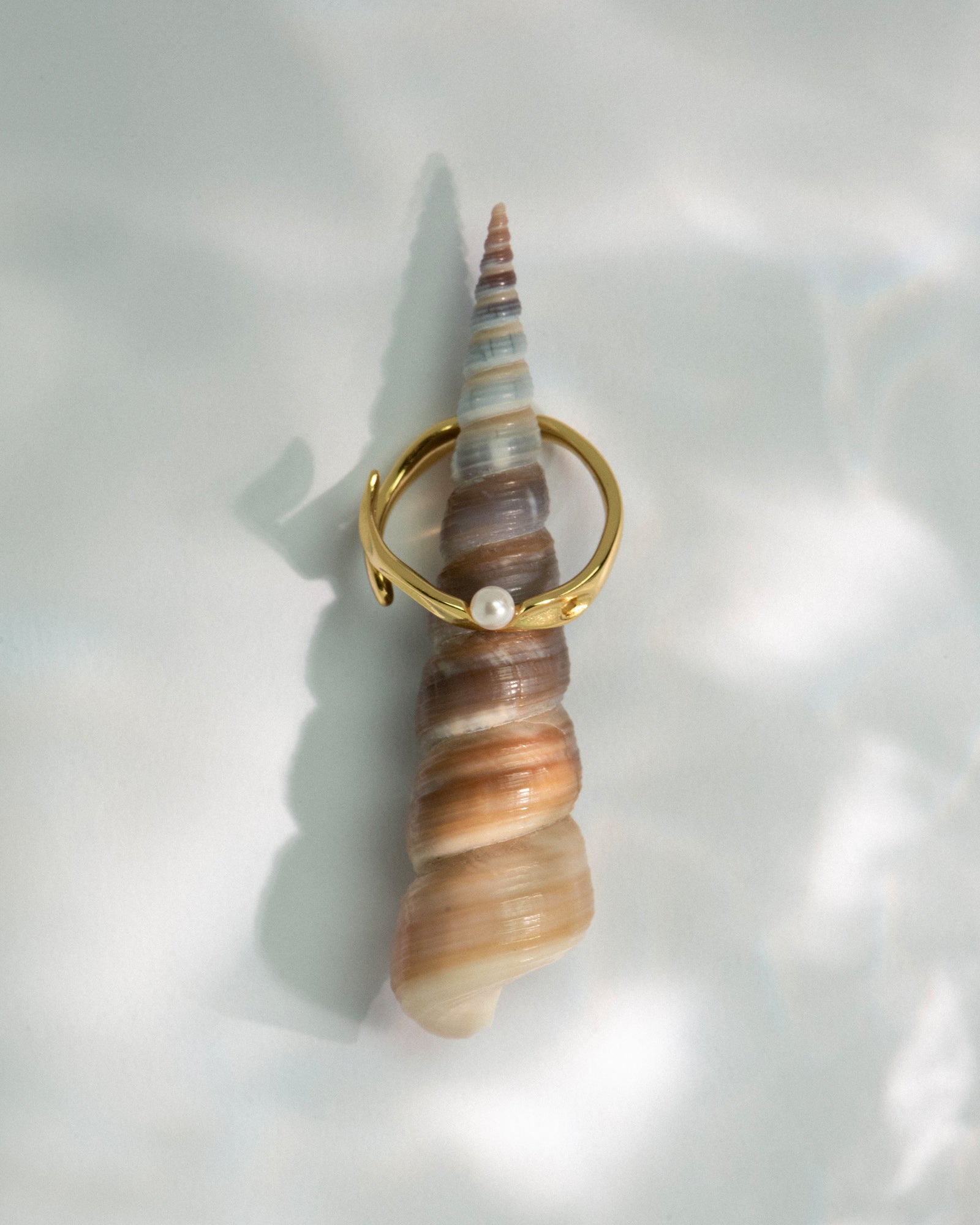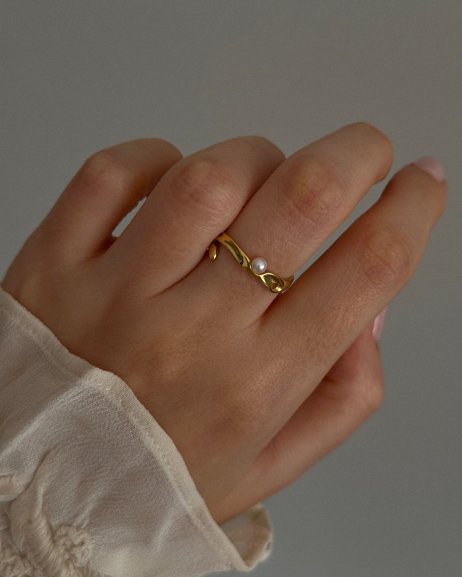 The Aveline Ring embodies graceful simplicity with its polished 18K gold-plated band, gently curved to mirror the elegance of natural forms. A delicate round pearl sits at its heart, radiating a subtle glow that speaks to timeless beauty. The Aveline shines beautifully on its own or layered with other rings for a refined, effortless touch.