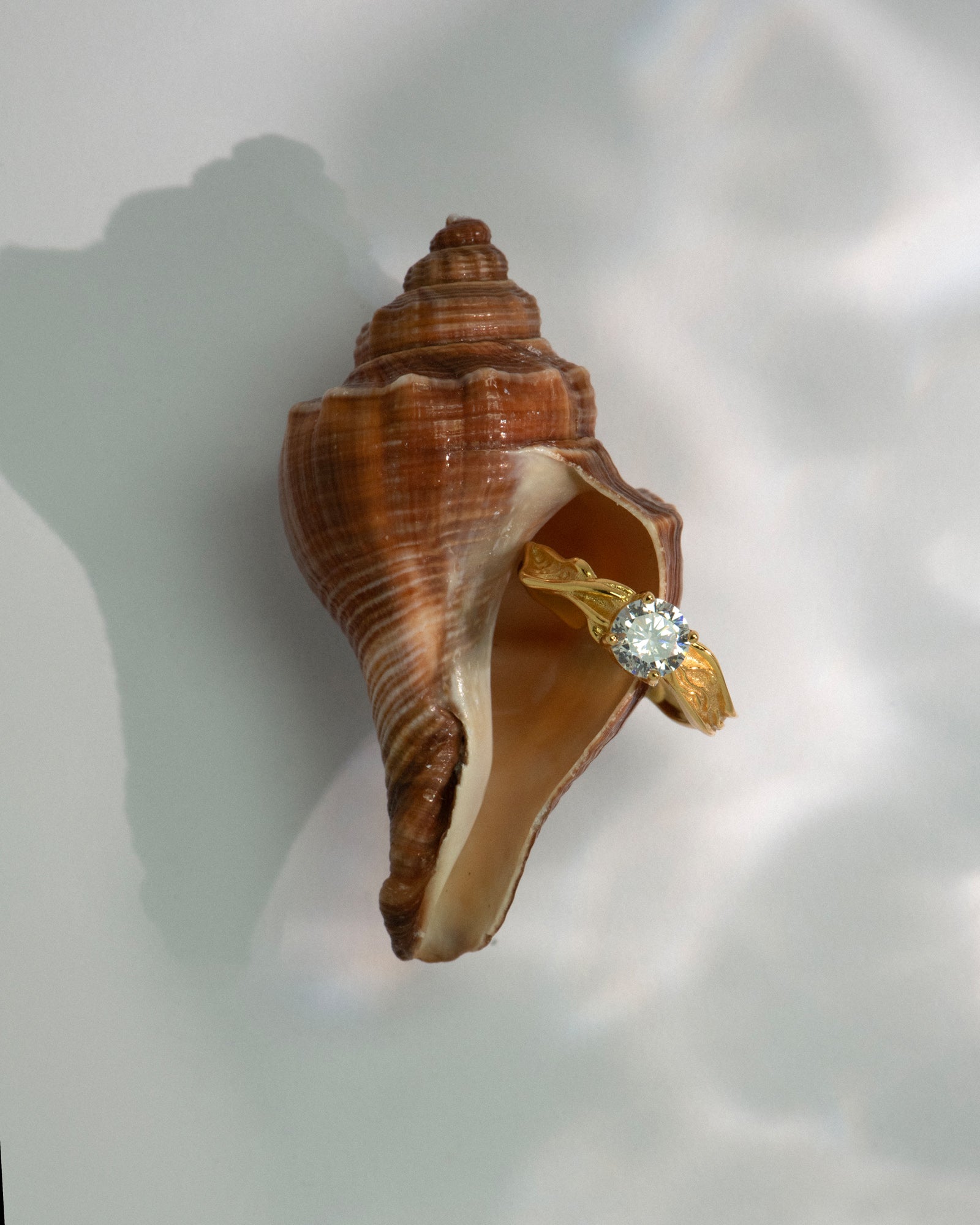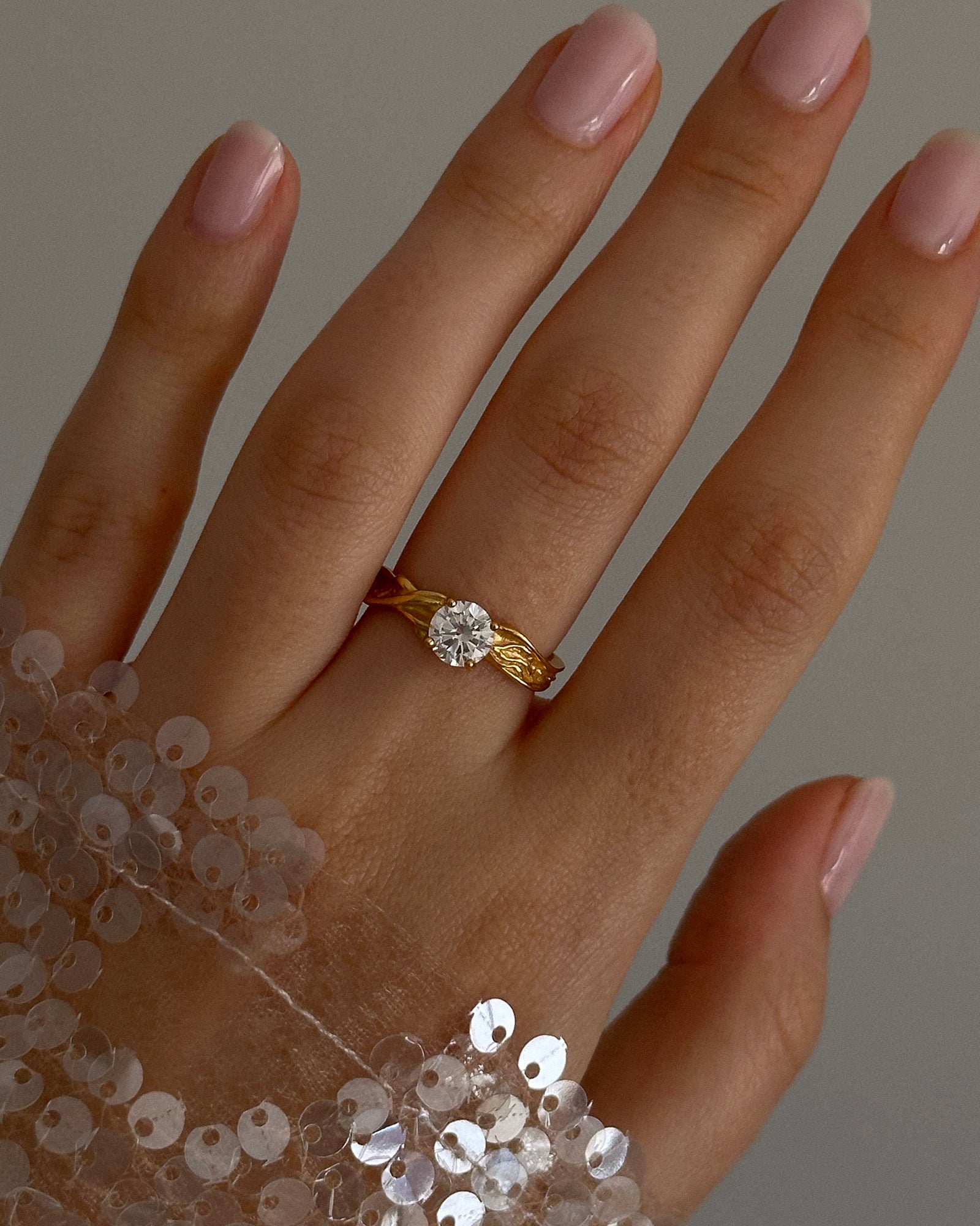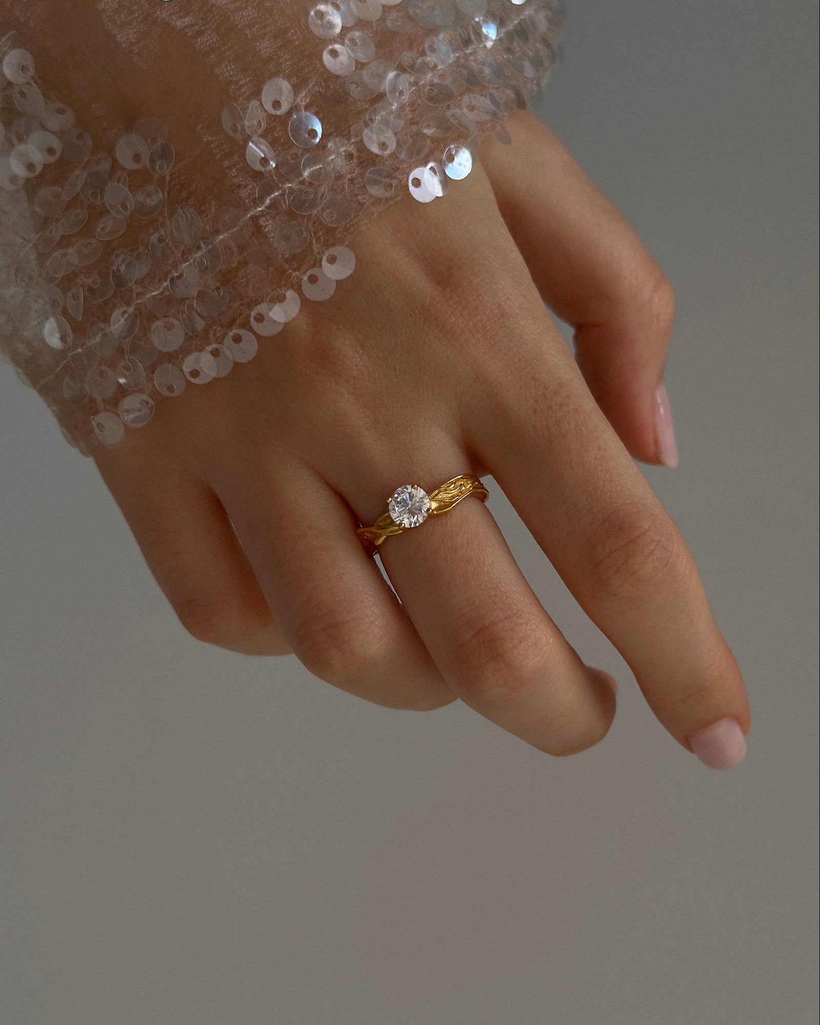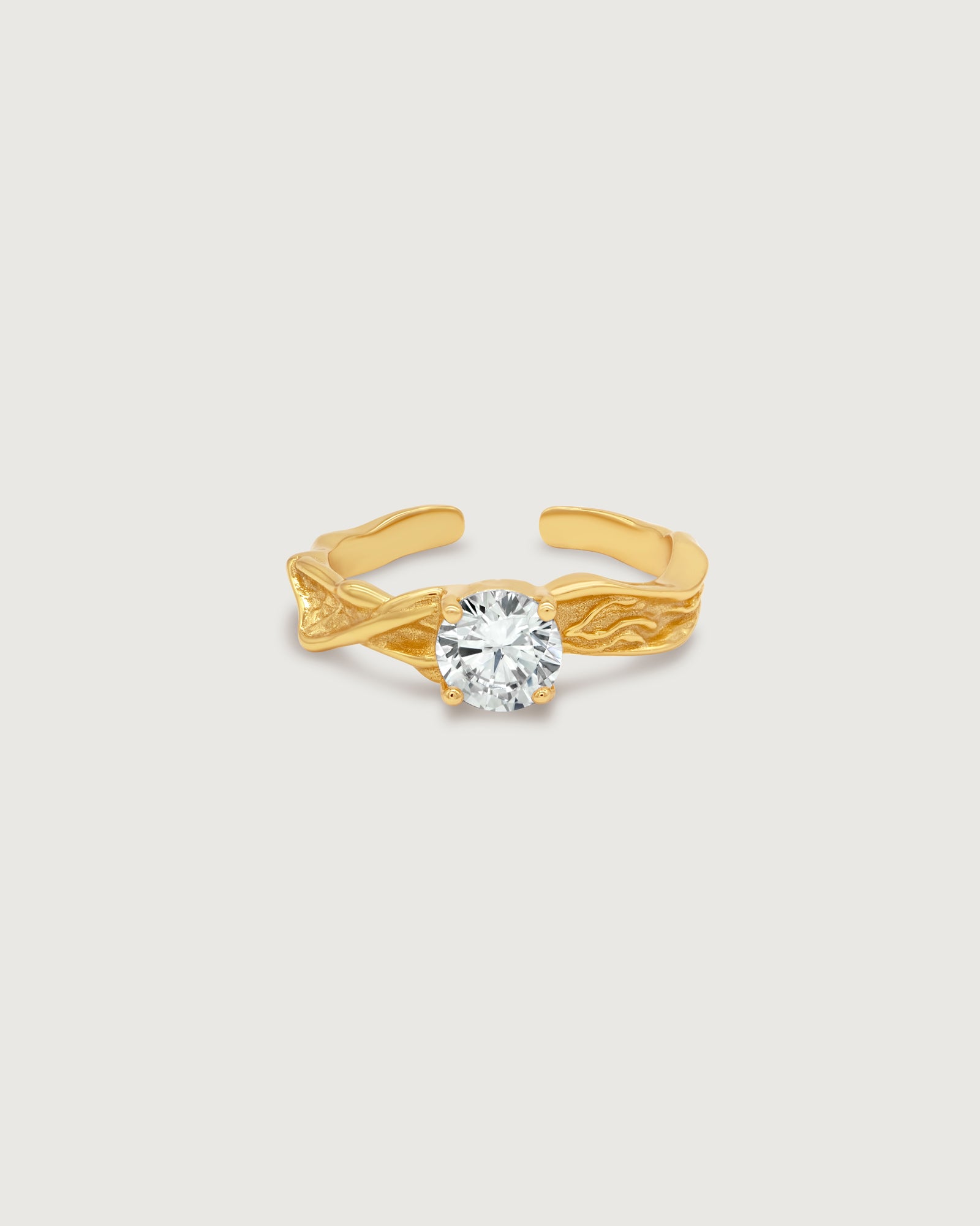The Nerissa Ring radiates effortless elegance. It features a textured gold band that flows in gentle, irregular waves, embodying vintage charm with a modern twist. A brilliant round cubic zirconia crystal graces the centre, lending a touch of refined sparkle. This design speaks to a modern romantic, offering a timeless statement that’s as unique as you are.
